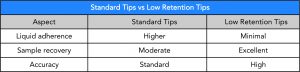 - Low retention tips focus on maximizing sample recovery and accuracy