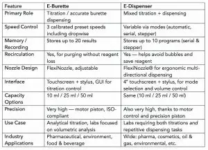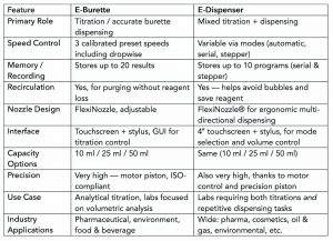 - If your lab’s primary function is titration / analysis, the E-Burette is likely the better pick.