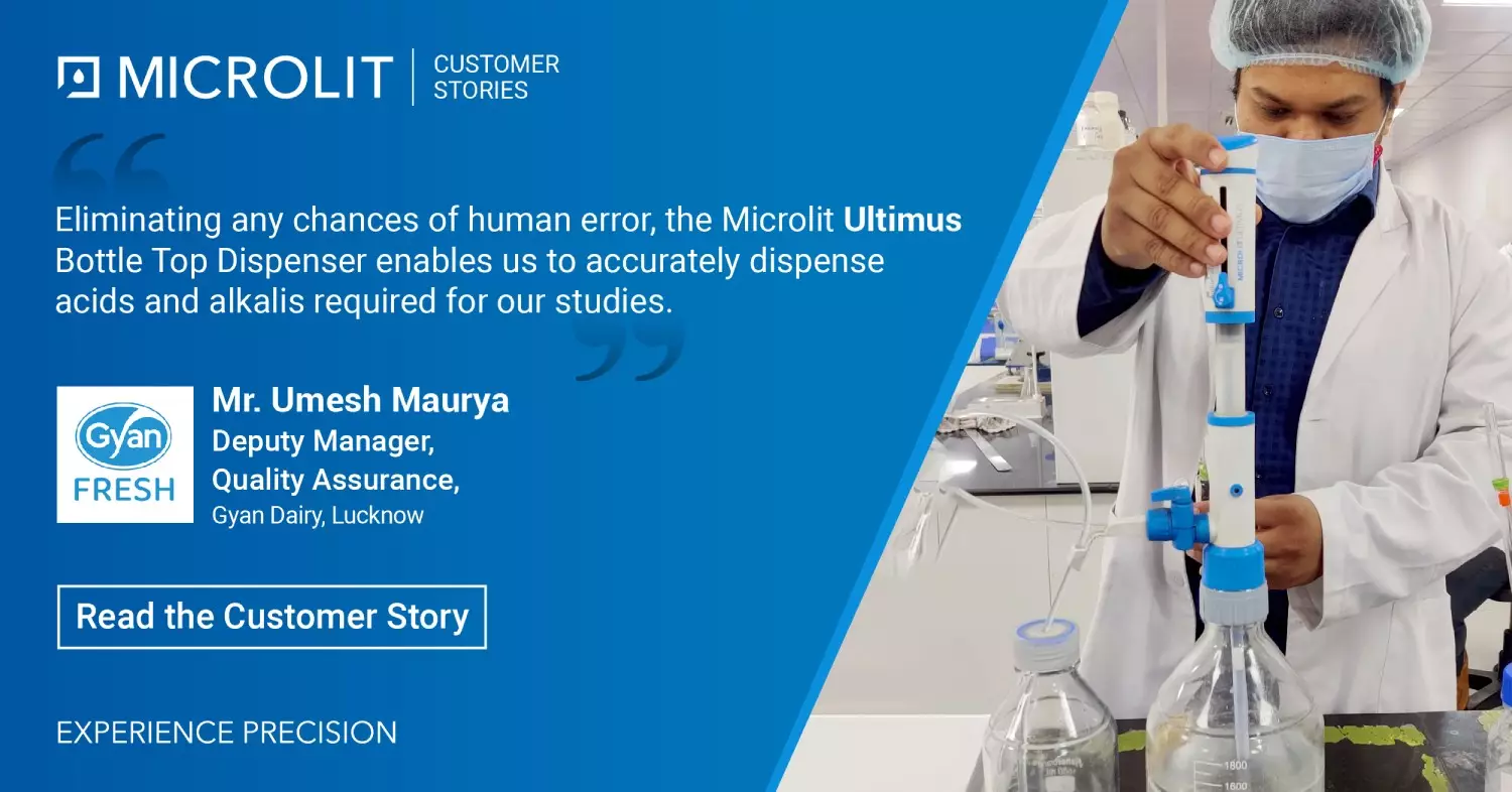 The Quality Lab of Gyan Dairy runs a series of tests to ensure that their customers receive fresh and pure dairy products. Ever since the company has replaced glass pipettes and tilt measures with Microlit Micropipettes and Microlit Bottle Top Dispensers, its lab operations have become less time-consuming and error-free.