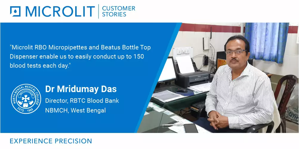 The RBTC Blood Bank in West Bengal uses Microlit RBO Micropipette and Microlit Beatus Bottle Top Dispenser. They are pleased with the Microlit RBO Micropipettes in particular, as it’s helping them conduct 150 blood tests on a daily basis with great ease.